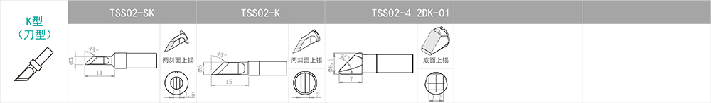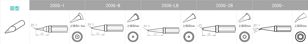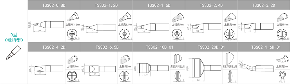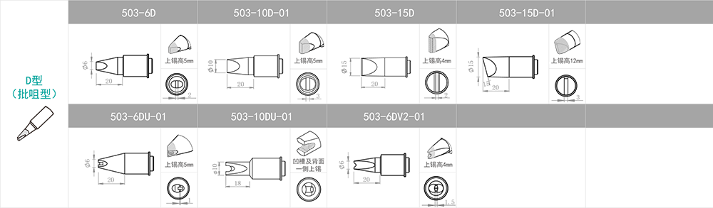 应用场合 | 适合精细之焊接, 或焊接空间狭小之情况, 也可以修正焊接芯片时产生之锡桥 | 适合一般焊接, 无论大小的焊点, 都可使用B型焊咀 | 适合需要多锡量之焊接。 例如焊接面积大、粗端子、 焊点大的焊接环境 | C型焊咀应用范围与D型焊咀相似。 例如焊接面积大,粗端子, 焊点大的情况适用 | 适用于SOJ、PLCC、 SOP、QFP、 电源、接地元件,修正锡桥, 连接器等焊接 |